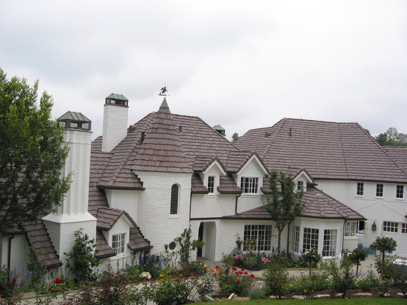 Staggered Auburn tile with copper gutter and custom chimney caps in Bel Air